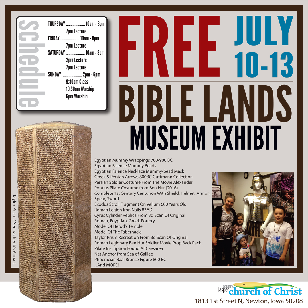 Event details Thursday | July 10, 2025 to Sunday | July 13, 2025 3:00 pm 1813 1st Street N, Newton, IA 50208 Step back in time and explore artifacts from Bible Lands! Free admission July 10–13 at Jasper County Church of Christ. Save Event to Calendar Save to iCalendar Save to Google Calendar Save to Outlook Save to Outlook Online Save to Yahoo! Calendar